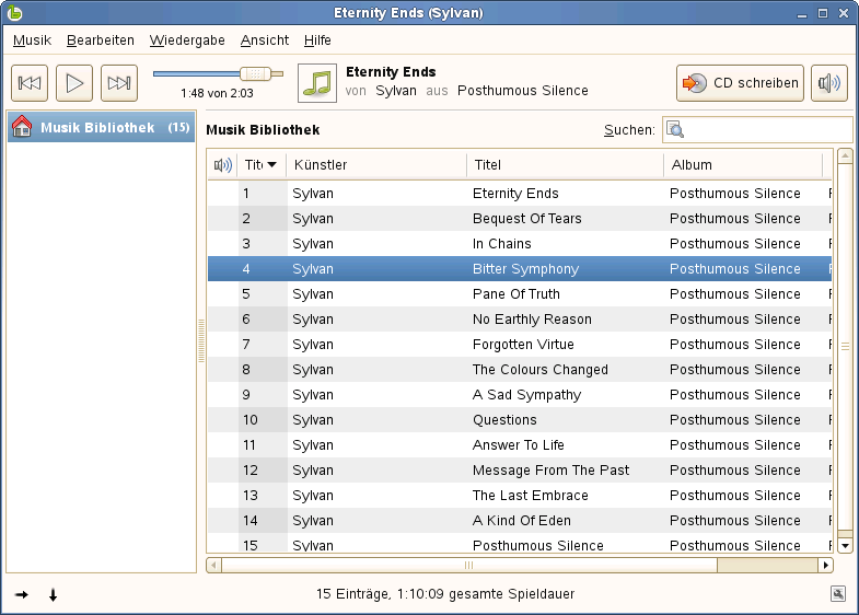 Helix Banshee verfügt über einen integrierten CD-Player. Wenn Sie eine Musik-CD einlegen, wird der Titel der CD im linken Fensterbereich angezeigt. Wenn Sie die CD vollständig abspielen möchten, wählen Sie ihren Titel aus und klicken Sie auf die .
