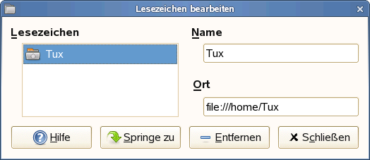 Klicken Sie auf . Das Lesezeichen wird der Liste hinzugefügt. Als Lesezeichenname wird der Ordnername verwendet. Wenn Sie eine Datei mit einem Lesezeichen versehen möchten, wird in Wirklichkeit der dazugehörige Ordner mit dem Lesezeichen versehen.