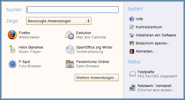 Wenn Sie ein Programm in openSUSE ausführen möchten, klicken Sie auf der Kontrollleiste auf , um das Hauptmenü zu öffnen. Wenn das gewünschte Programm im Hauptmenü nicht enthalten ist, klicken Sie auf , um eine Liste mit allen verfügbaren Anwendungen anzuzeigen. Navigieren Sie durch die Untermenüs und wählen Sie einen Eintrag, um das entsprechende Programm zu starten.
