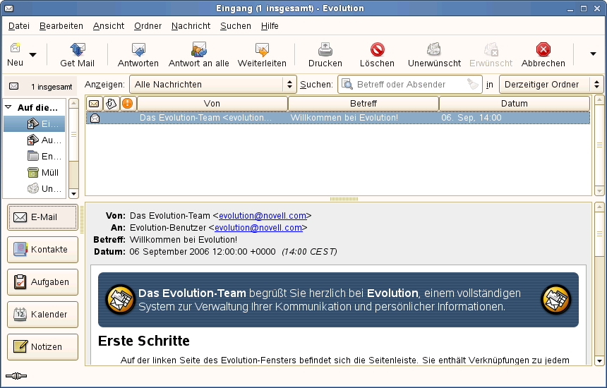 Evolution vereint die Funktionalität von E-Mail, Kalender, Adressbuch und Terminplaner in einer einzigen, einfach zu bedienenden Anwendung. Dank seiner umfassenden Unterstützung gängiger Kommunikations- und Datenaustauschstandards kann Evolution auch in bereits bestehenden Firmennetzwerken Seite an Seite mit vorhandenen Anwendungen wie Microsoft* Exchange eingesetzt werden.