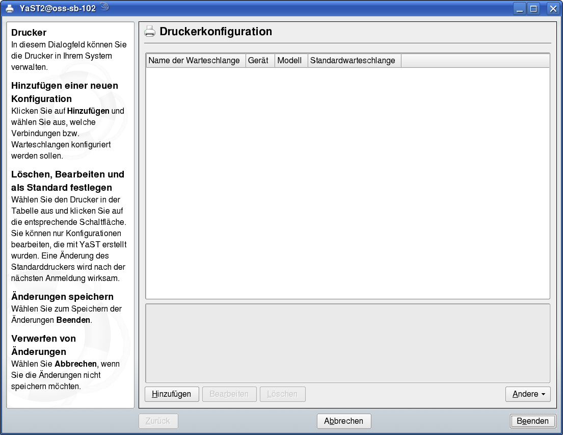 Sie können Drucker mit YaST konfigurieren. Starten Sie YaST und wählen Sie , um das Hauptfenster für die Druckerkonfiguration zu öffnen. Abhängig von der Netzwerkumgebung oder Ihrem lokalen Druckermodell kann YaST den Drucker möglicherweise automatisch konfigurieren. Wenn die automatische Erkennung von Druckgeräten fehlschlägt, klicken Sie im Dialogfeld auf , um den manuellen Konfigurationsarbeitsgang zu starten. Folgen Sie den Anleitungen in der YaST-Online-Hilfe. Wenn Sie sich nicht sicher sind, welche Option Sie wählen und welche Daten Sie eingeben sollten, fragen Sie Ihren Systemadministrator.