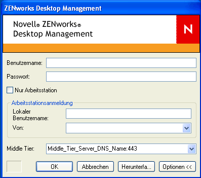 Wenn das Installationsprogramm für den Desktop Management-Agenten einen Eintrag für die IP-Adresse oder den DNS-Namen des Middle Tier-Servers benötigt, müssen Sie den Eigennamen eingeben, den Sie bei der Erstellung der Zertifikatsanfrage verwendet haben. Weitere Informationen hierzu finden Sie in Schritt 5.f.