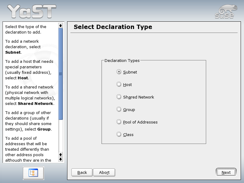 Selecting the Declaration Type: The Global Options of the DHCP server are made up of a number of declarations. This dialog lets you set the declaration types Subnet, Host, Shared Network, Group, Pool of Addresses, and Class. This example shows the selection of a new subnetwork (see Figure 117).