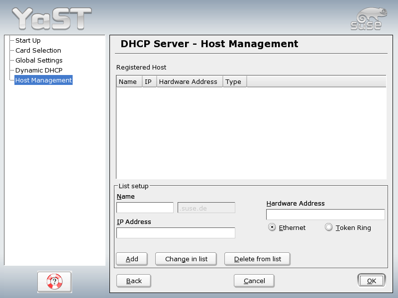 The DHCP module of YaST allows you to set up your own DHCP server for the local network. The module can work in two different modes: