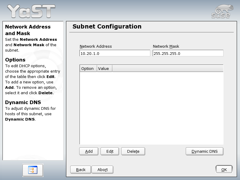 Subnet Configuration: This dialog allows you specify a new subnet with its IP address and netmask. In the middle part of the dialog, modify the DHCP server start options for the selected subnet using Add, Edit, and Delete. To set up dynamic DNS for the subnet, select Dynamic DNS.