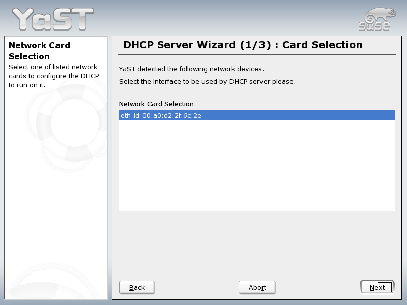 Selecting the Network Interface: In the first step, YaST looks for the network interfaces available on your system then displays them in a list. From the list, select the interface on which the DHCP server should listen. See Figure 114.