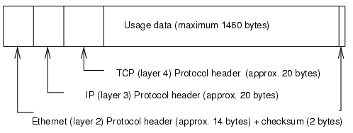 The proof sum is located at the end of the packet, not at the beginning. This simplifies things for the network hardware. The largest amount of usage data possible in one packet is 1460 bytes in an ethernet network.