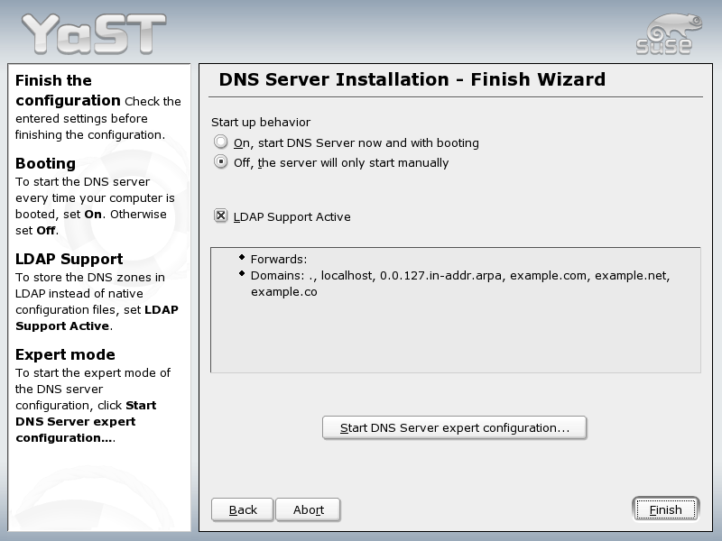 DNS Server Installation: Finish Wizard: In the final step, specify whether the DNS server should always be started as part of the boot procedure and whether it should use LDAP support. See Figure 85.