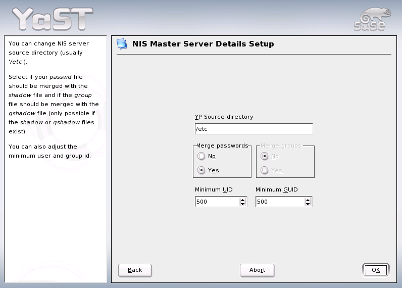 By clicking Other Global Settings..., access a screen, shown in Figure 108, in which to change the source directory of the NIS server (/etc by default). In addition, passwords and groups can be merged here. The setting should be Yes so the files (/etc/passwd, /etc/shadow, and /etc/group) can be synchronized. Also determine the smallest user and group ID. Press OK to confirm your settings and return to the previous screen. Then click Next.