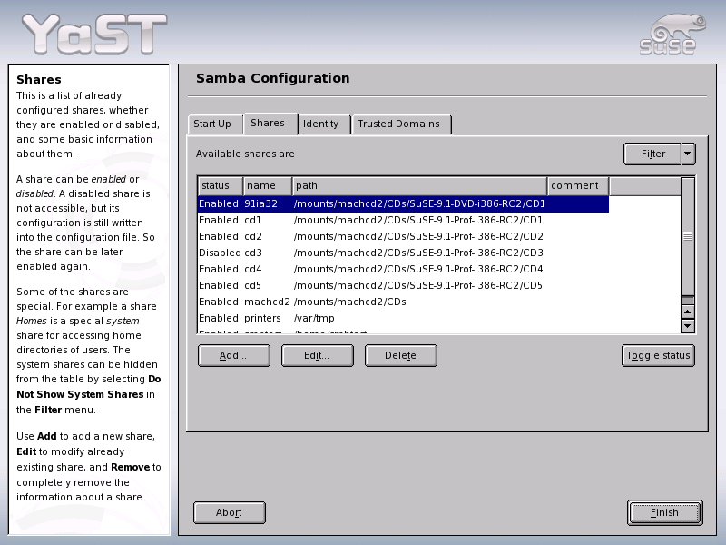 Beginning from version 9.1, the SUSE LINUX samba package provides version 3 of the Samba suite, which brings some important added features: