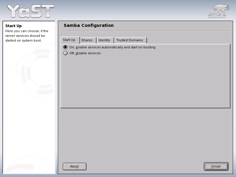 In Start Up (Figure 119), select whether to start Samba. If you activate Samba, the service is started every time the system boots.