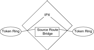 The virtual internal ring is attached to each bridged interface through a separate virtual internal bridge, as described in "Multiport Bridging.” In this case, the required protocol must be attached to the virtual internal ring through a virtual token ring board that uses the SRBRIDGE.LAN driver. The virtual board is then attached to the virtual internal ring automatically. When the bridge logic is attached to a LAN or WAN interface, the virtual internal ring is automatically attached to the bridge. Each attachment of the bridge protocol to an interface essentially causes the creation of a virtual internal bridge for that interface. With this procedure, a protocol is attached to the LAN or WAN interface indirectly (through the SRBRIDGE.LAN driver, virtual internal ring, and bridge protocol). An example of this configuration using the IPX protocol is shown in Figure 4-9. Note that the two token rings might be part of a larger, looped topology.