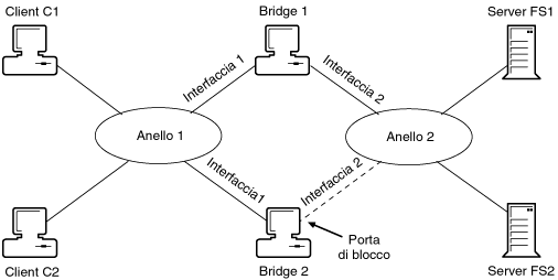 For example, in Figure 4-14, Clients C1 and C2 are on Ring 1, and Servers FS1 and FS2 are on Ring 2. Two parallel bridges, Bridge 1 and Bridge 2, connect the rings. Bridge 1 and Bridge 2 are configured to use the Spanning Tree Protocol, causing the blocked port (Interface 2) of Bridge 2.