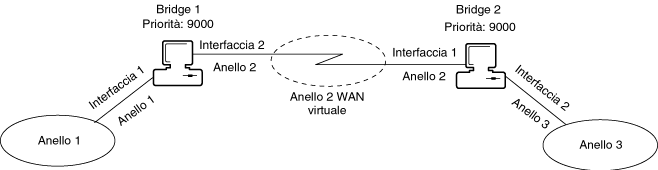 This method of configuring a WAN link requires the use of a virtual WAN ring. Each bridge interface connected to the virtual WAN ring must be assigned the appropriate ring number. For example, in Figure 4-15, Bridge 1, Interface 2, is configured with Ring 2. Likewise, Bridge 2, Interface 1, is configured with Ring 2.