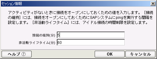 セッション接続プールがSAP接続リソースに選択された場合、[詳細]ボタンを使用すると、[セッション情報]ダイアログボックスが表示されます。[セッション情報]ダイアログボックスでは、管理対象のセッション接続に対して[接続の維持]および[非活動ライフタイム]オプションを設定できます。