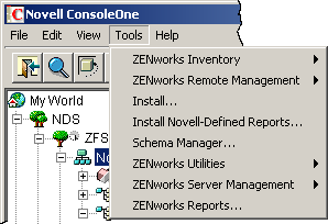 [Tools]>[ZENworks Server Management]の順にクリックすると、次のオプションが表示されます。