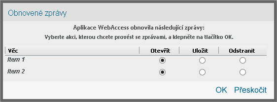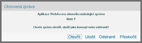 Přeskočit: Zachová uložené zprávy na disku, ale neobnoví je v programu WebAccess. Při dalším spuštění programu WebAccess se znovu zobrazí okno automatického uložení.