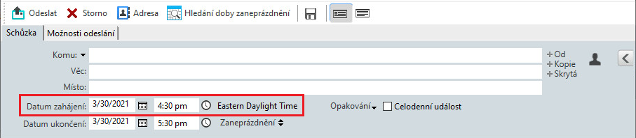Příklad: Pokud naplánujete schůzku na 16:30 v pásmu EDT v USA a vy se nacházíte v pásmu PDT, schůzka se bude ve vašem kalendáři zobrazovat s časem 13:30. Časové pásmo se také nyní zobrazuje v záhlaví schůzky vedle času zahájení: