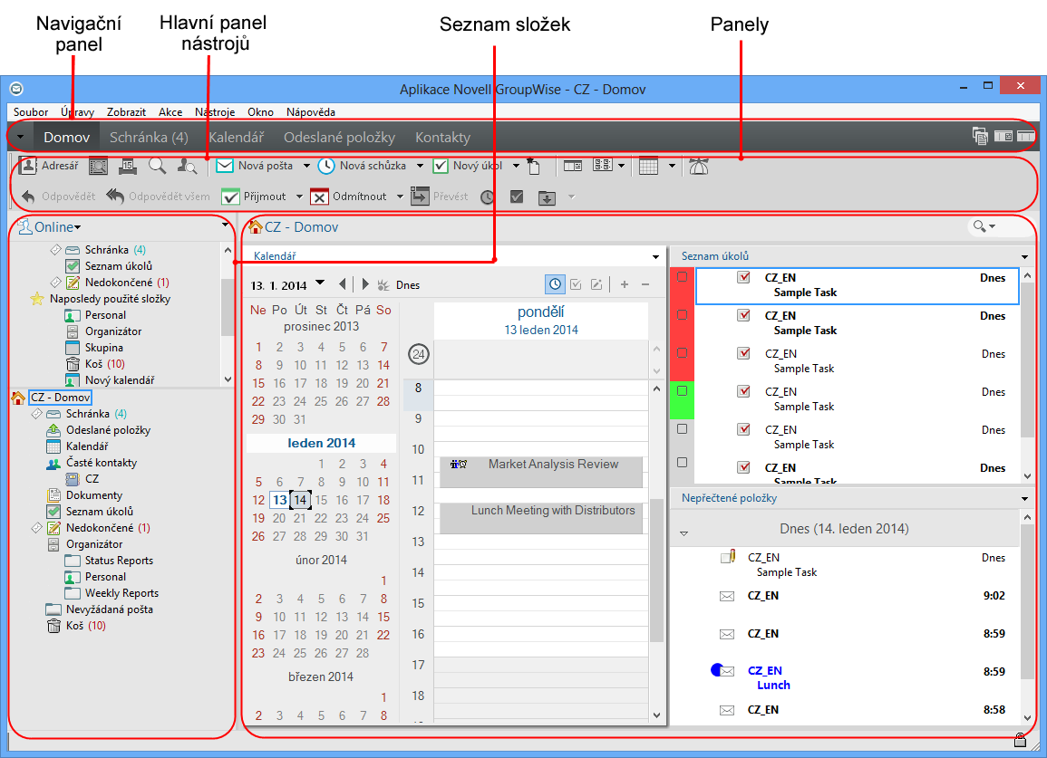 Hlavní pracovní plocha aplikace GroupWise se nazývá hlavní okno. V hlavním okně můžete číst zprávy, plánovat schůzky, prohlížet kalendář, spravovat kontakty, měnit režim spuštění aplikace GroupWise, otevírat složky a dokumenty a provádět mnoho dalších operací.
