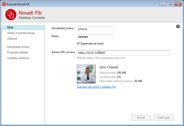 Adresa URL serveru: Zadejte adresu URL serveru Filr, se kterým chcete synchronizovat váš počítač. Například https://Filr.mojefirma.cz:8443.