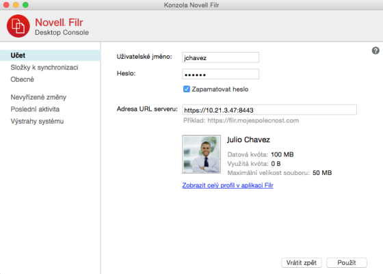 Adresa URL serveru: Zadejte adresu URL serveru Filr, se kterým chcete synchronizovat váš počítač. Například https://Filr.mojefirma.cz:8443.