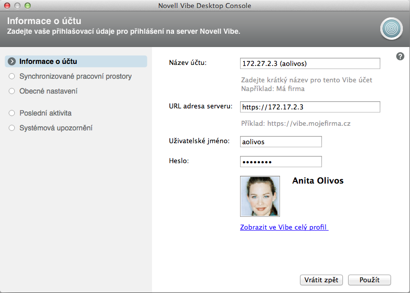 Při prvním nastavení Vibe Desktop musíte zadat informace o vašem portálu Vibe a vašem účtu. Informace o portálu Vibe a vašem účtu jde kdykoli později změnit:
