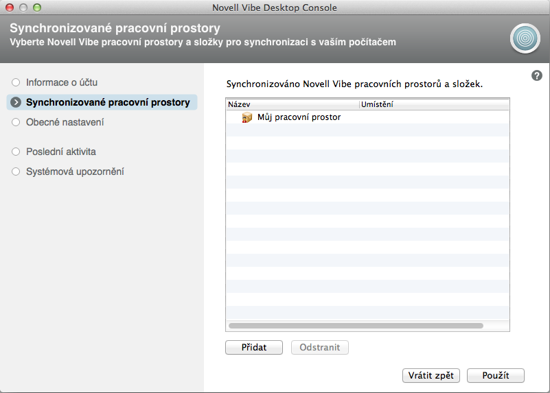 Po stažení a instalaci Vibe Desktop, která je popsána v kapitole Stažení a instalace aplikace Vibe Desktop, budete vyzváni k jeho nastavení. Tento proces zahrnuje zadání informací o účtu, volbu které pracovní prostory a složky mají být synchronizovány a volbu umístění informací v souborovém systému počítače.