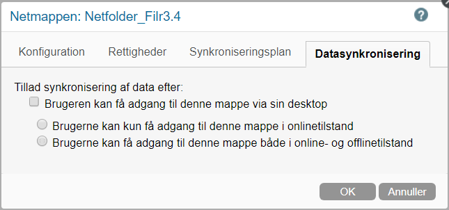 På fanen Datasynkronisering skal du fravælge indstillingen Brugeren kan få adgang til denne mappe via sin desktop.