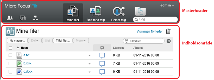 Første gang du starter Filr i en webbrowser, får du vist siden Mine filer. Du kan administrere alle de filer, du har oprettet, på denne side.