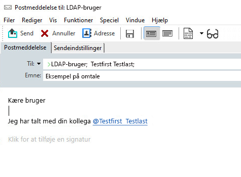 Funktionen Omtaler giver dig mulighed for at bruge smart navnesøgning i adressebogen i meddelelsesteksten i Send elementer, så du hurtigt både kan føje modtagere til feltet Til og fremhæve disse modtagere direkte i meddelelsesteksten via det linkede, fremhævede navn, der indsættes i meddelelsen.