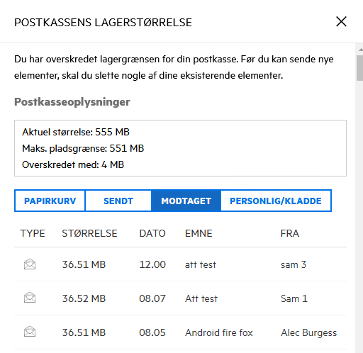 Hvis du forsøger at sende en e-mail, der resulterer i, at du overskrider lagergrænsen, får du besked om det. Du kan finde oplysninger om, hvordan du reducerer størrelsen på din postkasse, under Reducere størrelsen af postkassen.