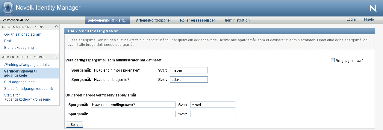Når du har gemt verificeringssvarene, viser brugerprogrammet en meddelelse om, at verificeringssvarene blev gemt, og skærmen med verificeringssvar åbnes igen med "Brug lagret svar?" markeret.