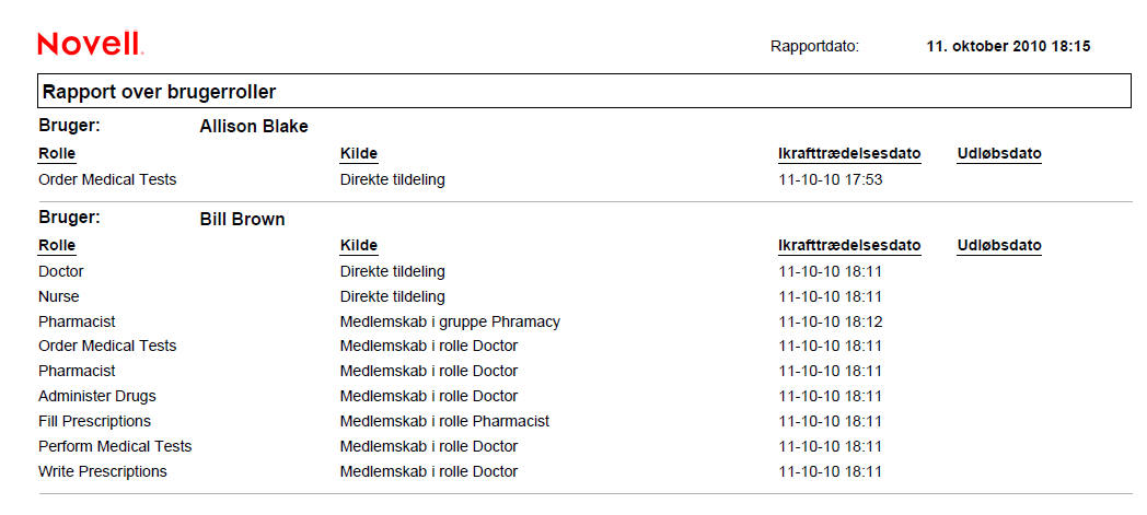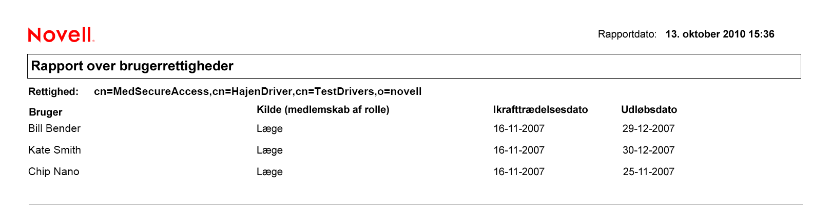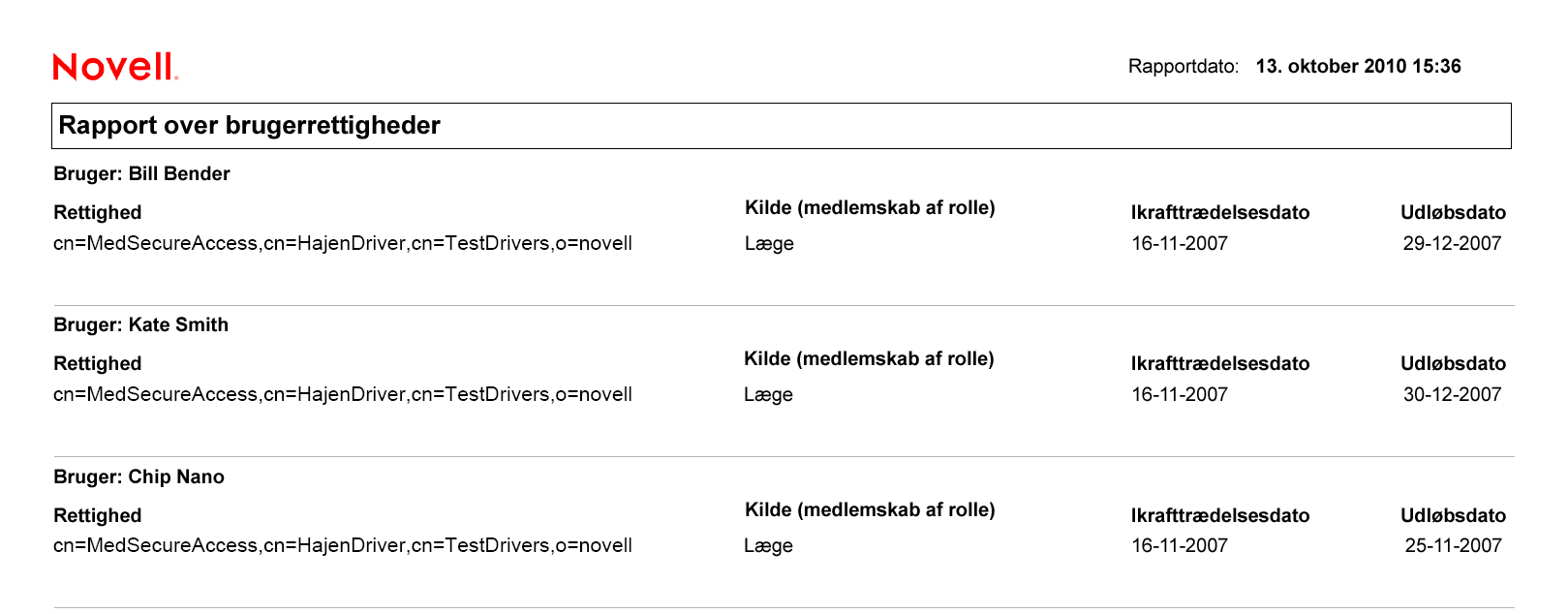 Figur 19-5 Eksempel på rapport over brugerrettigheder: brugeroplysninger for hver enkelt rettighed
