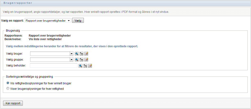 Figur 19-4 Eksempel på rapport over brugerrettigheder: rettighedsoplysninger for hver enkelt bruger