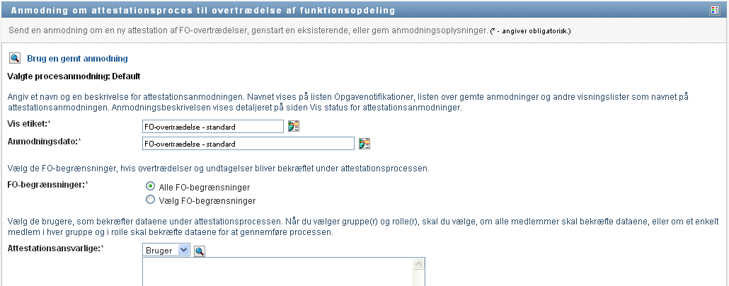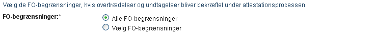 Du skal vælge mindst én FO-begrænsning for at starte en attestationsproces. Du behøver dog ikke at vælge en FO-begrænsning for at gemme en anmodning.