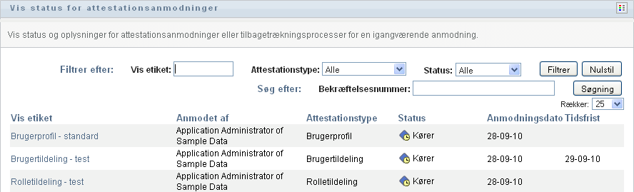 Brugerprogrammet viser den aktuelle status for alle attestationsanmodninger.