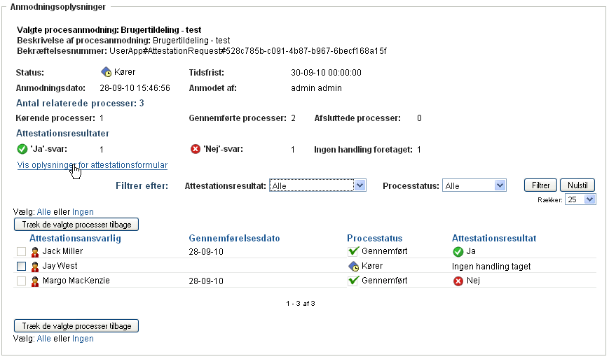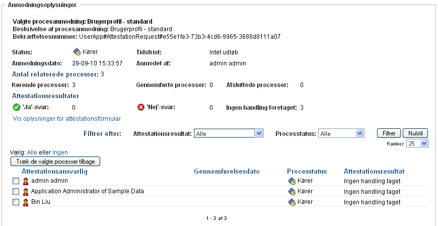 Vælg de attestationsansvarlige, og klik på for at trække en eller flere processer tilbage. Klik på , hvis du vil trække alle processer tilbage. Klik på for at rydde valget.