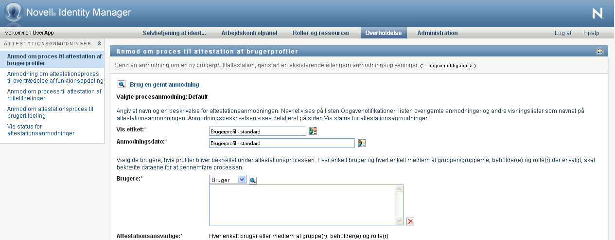 Fanen åbner som standard siden Anmod om proces til attestation af brugerprofiler.