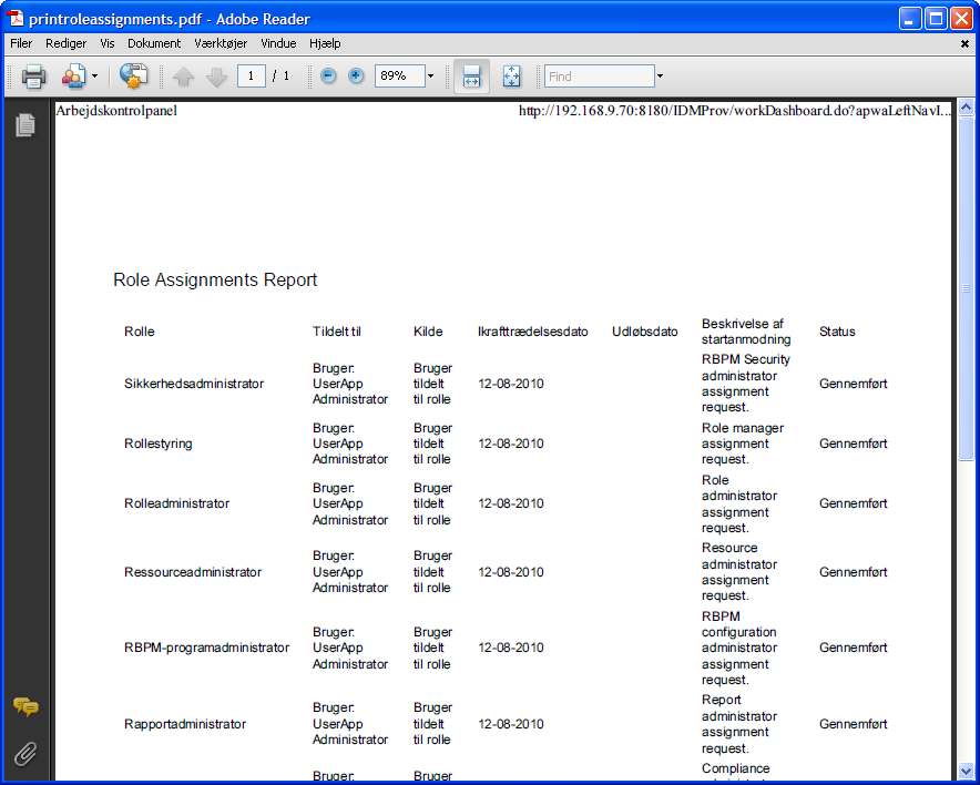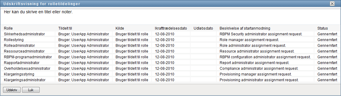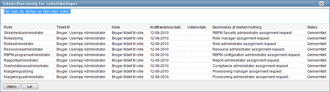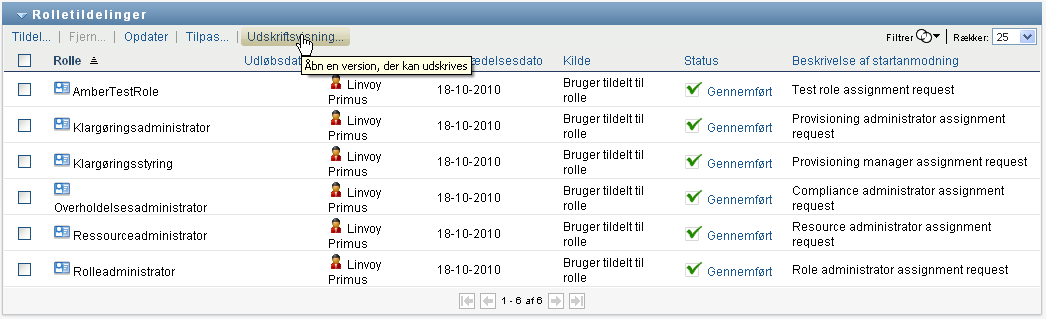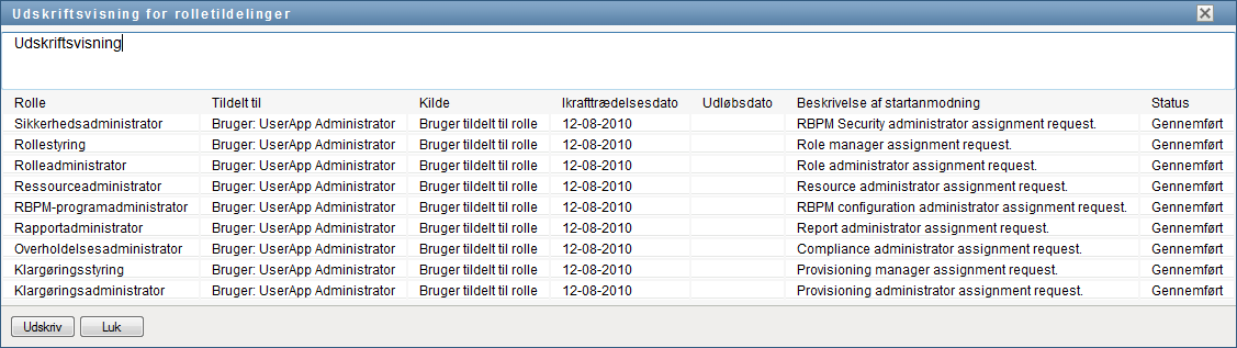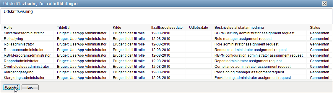 Brugerprogrammet åbner en version af rolletildelingslisten, der kan udskrives, i et separat vindue:
