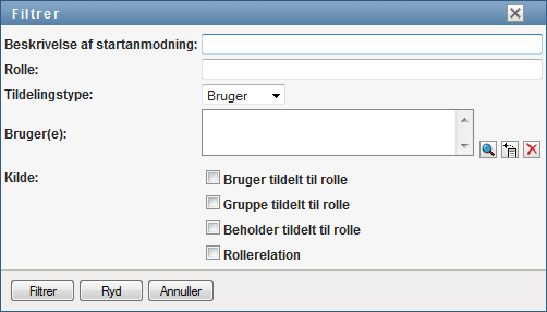 Angiv en filterstreng for startanmodningsbeskrivelsen eller for rollenavnet, eller begræns søgningen ved at vælge en type tildeling (, , eller ) og et sæt identiteter, der har den valgte tildelingstype. Du kan også begrænse søgningen ved at vælge en kildetype for rolletildelingen (, , eller ).