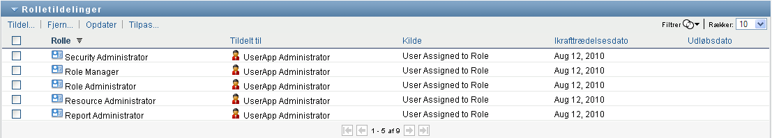 Listen over roller åbnes. Hvis du ikke er i administreret tilstand, er de viste rolletildelinger dem, som du er modtageren for.