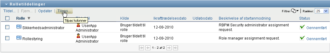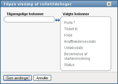 I afsnittet i kontrolpanelet kan du vælge og fravælge kolonner samt ændre rækkefølge på kolonner i opgavelistevisningen. Kolonnevalg og -rækkefølge styres af indstillinger i dialogboksen Tilpas visning af rolletildelinger. Når du ændrer kolonnelisten eller ændrer rækkefølge på kolonnerne, gemmes dine tilpasninger i identitetsboksen sammen med dine andre brugerindstillinger.