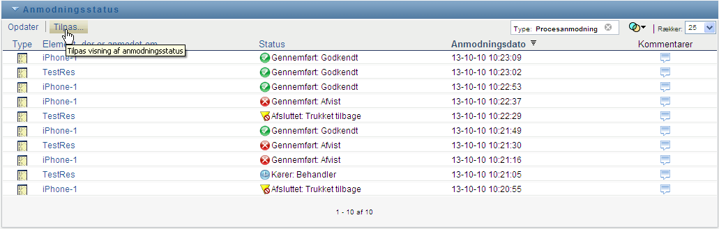 I afsnittet Anmodningsstatus på siden Arbejdskontrolpanel kan du vælge og fravælge kolonner samt ændre rækkefølge på kolonner i anmodningslistevisningen. Tilpasninger, som du foretager af visningen, gemmes til senere brug.
