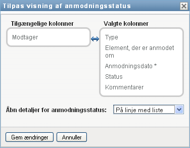 Kolonnerne og er obligatoriske kolonner og kan ikke fjernes fra anmodningslistevisningen.