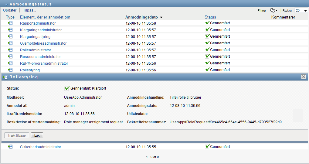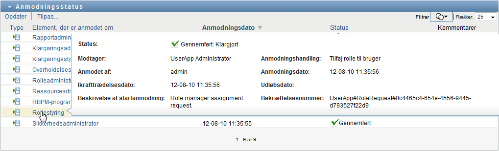 Når en rolle er valgt, indeholder listen anmodninger, der har den valgte rolle som modtager.