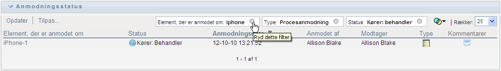 Anmodningslisten opdateres og afspejler den aktuelle tilstand for anmodningslisten for den aktuelle bruger. Knappen fjerner ikke nogen filtre, der er anvendt på anmodningslisten. Når du opdaterer anmodningslisten, bruges definerede filtre til at opdatere listen, og filtrene er i kraft, indtil de nulstilles.