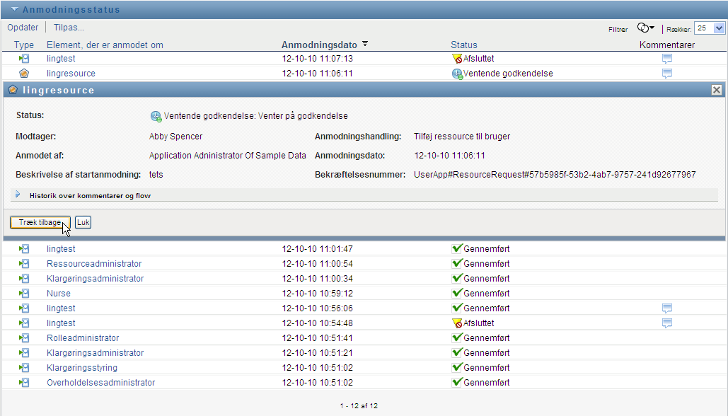 Listen over anmodninger åbnes. Hvis du ikke er i administreret tilstand, er de viste anmodninger dem, som du er modtageren eller anmoderen for. Hvis du er i administreret tilstand, er de viste anmodninger dem, som den valgte bruger, gruppe eller beholder er modtageren eller anmoderen for.