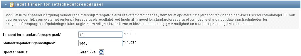 Disse indstillinger styrer funktionsmåden for rettighedsforespørgsler, der foretages af brugerprogrammet. Du kan definere et timeoutinterval og en opdateringshastighed for rettighedsforespørgsler. Du kan derudover se, om rettighedsværdierne er blevet opdateret, og om nødvendigt begynde en manuel opdatering.
