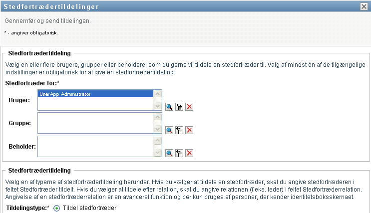 Hvis du er administrator af klargøringsprogrammet, viser brugerprogrammet følgende grænseflade, hvor du kan definere stedfortrædertildelinger:
