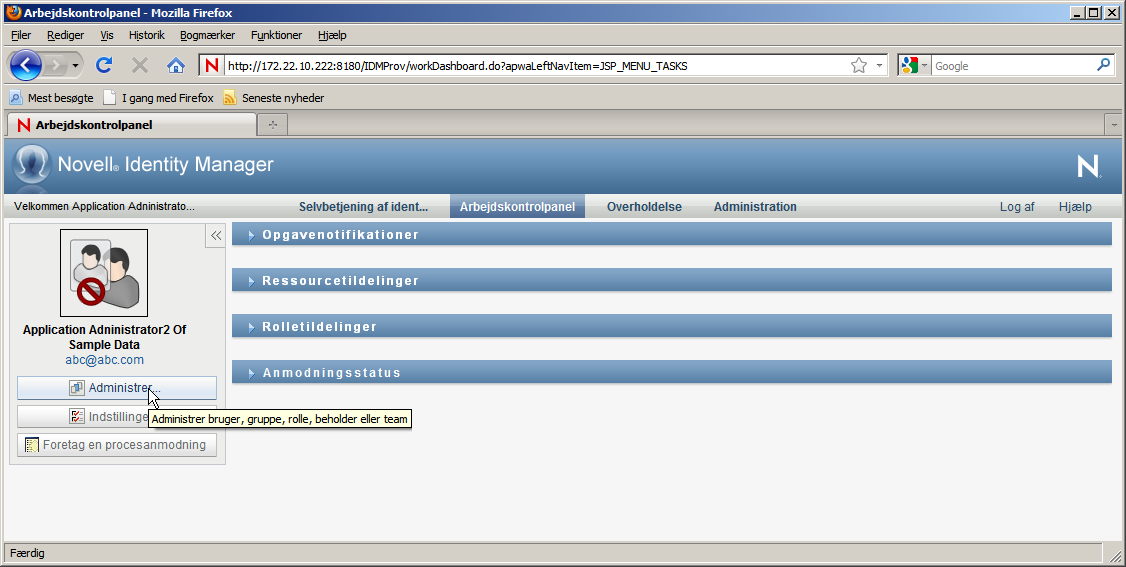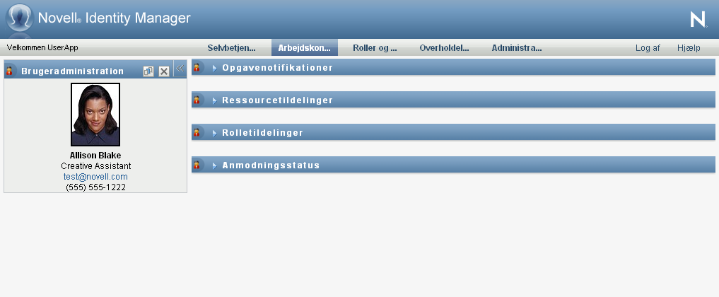 Når du vælger en bruger, gruppe, beholder, rolle eller et team, sætter arbejdskontrolpanelet dig i administrationstilstand og opdaterer afsnittet Brugerprofil til venstre på skærmen. Brugerprofilens visning opdateres som følger: